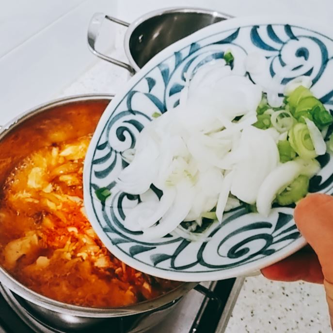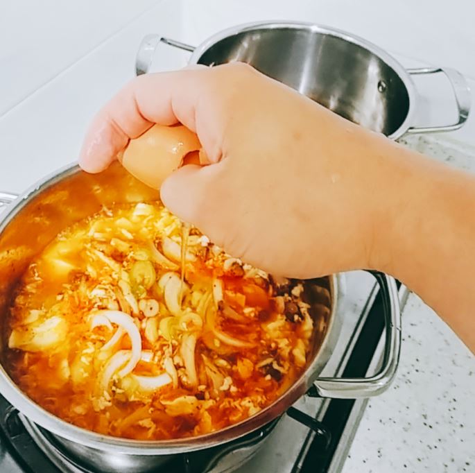 양파와 대파, 달걀을 넣고 2분간 더 끓여 주세요.